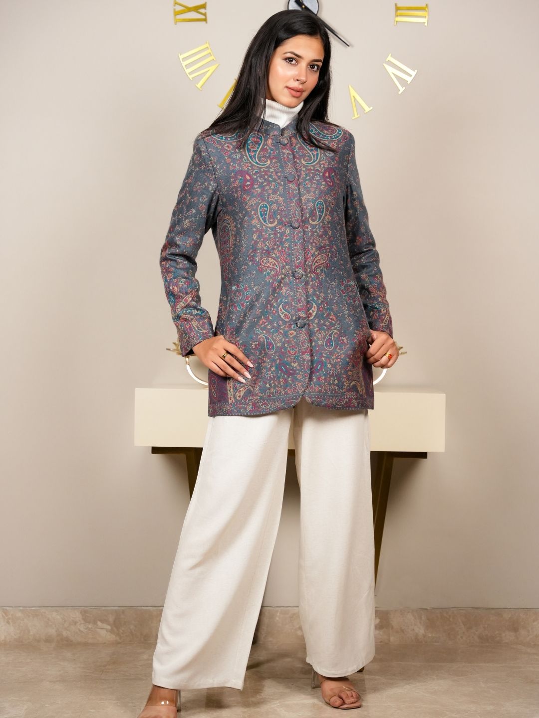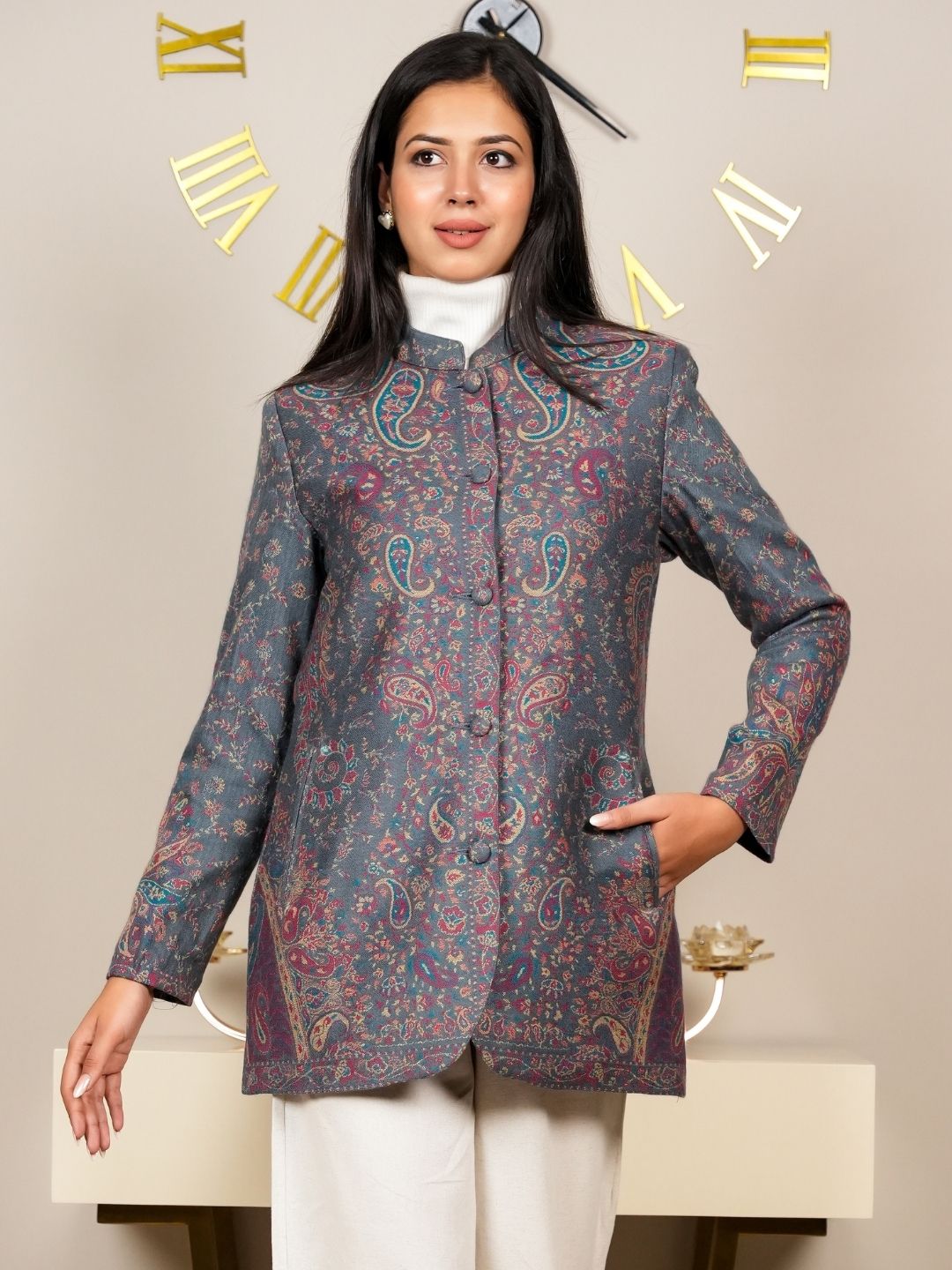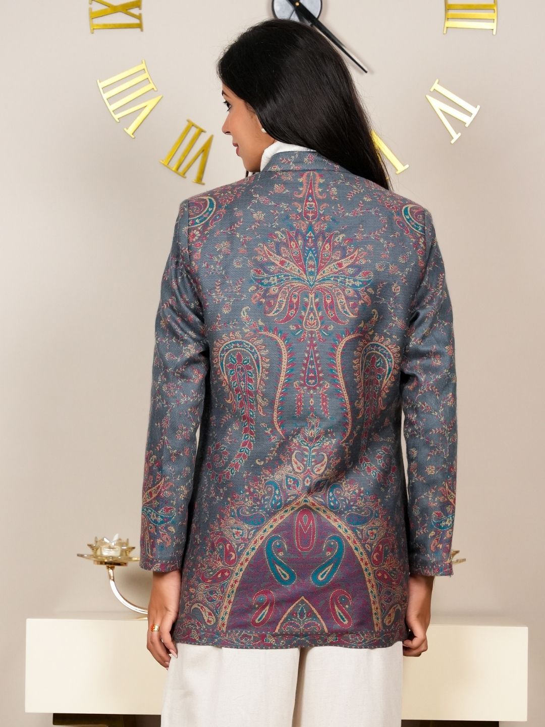 Adorned with intricate Kani patterns that showcase the craftsmanship and heritage of traditional weaving, adding a unique touch to the coat. Designed to drape beautifully, this coat flatters your figure while allowing for comfortable movement.