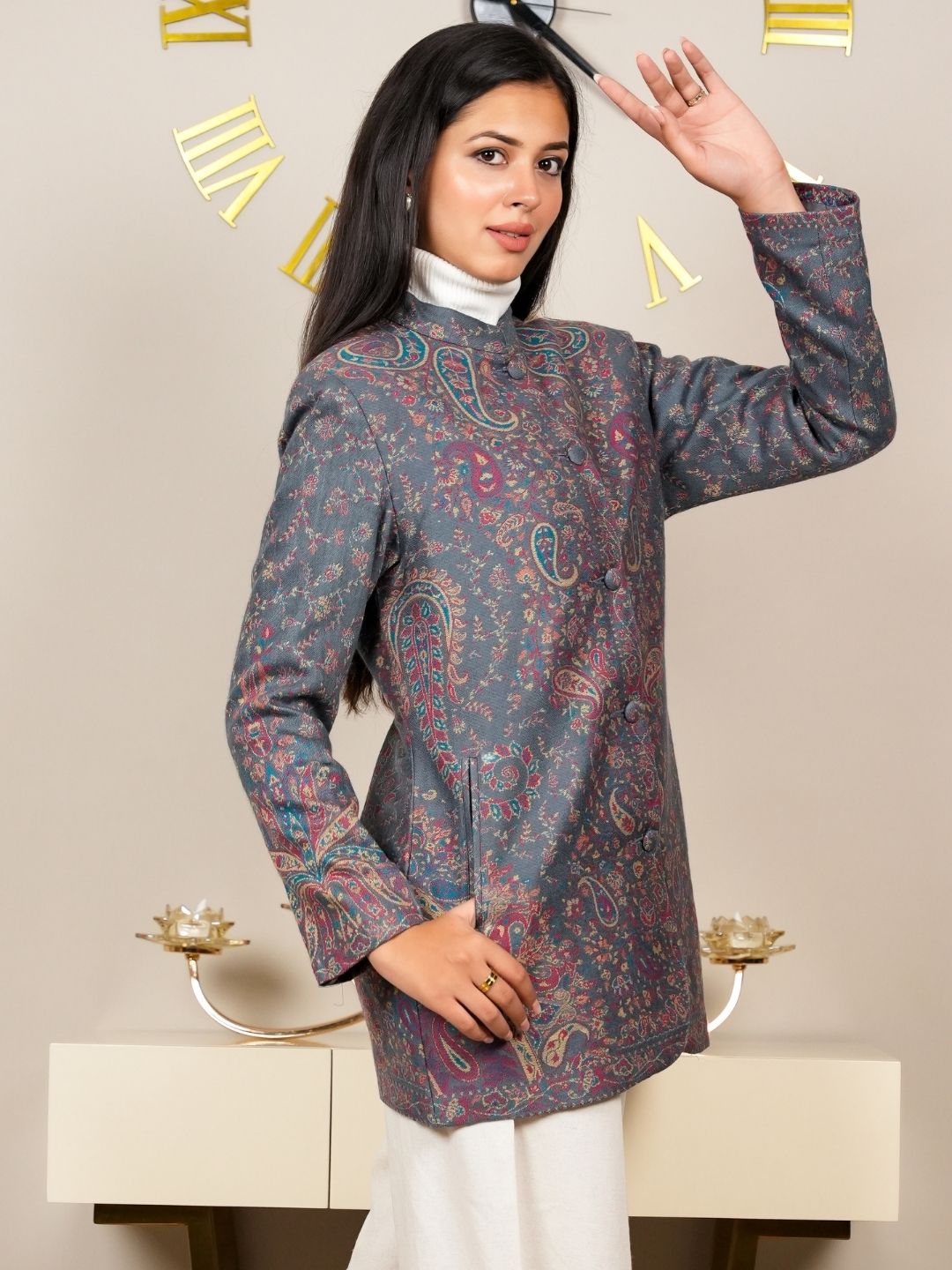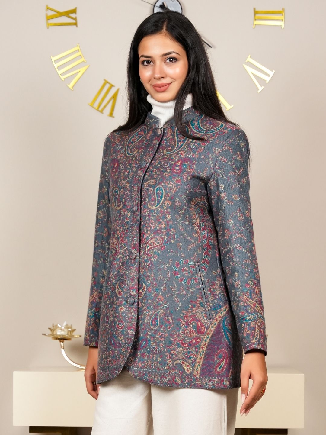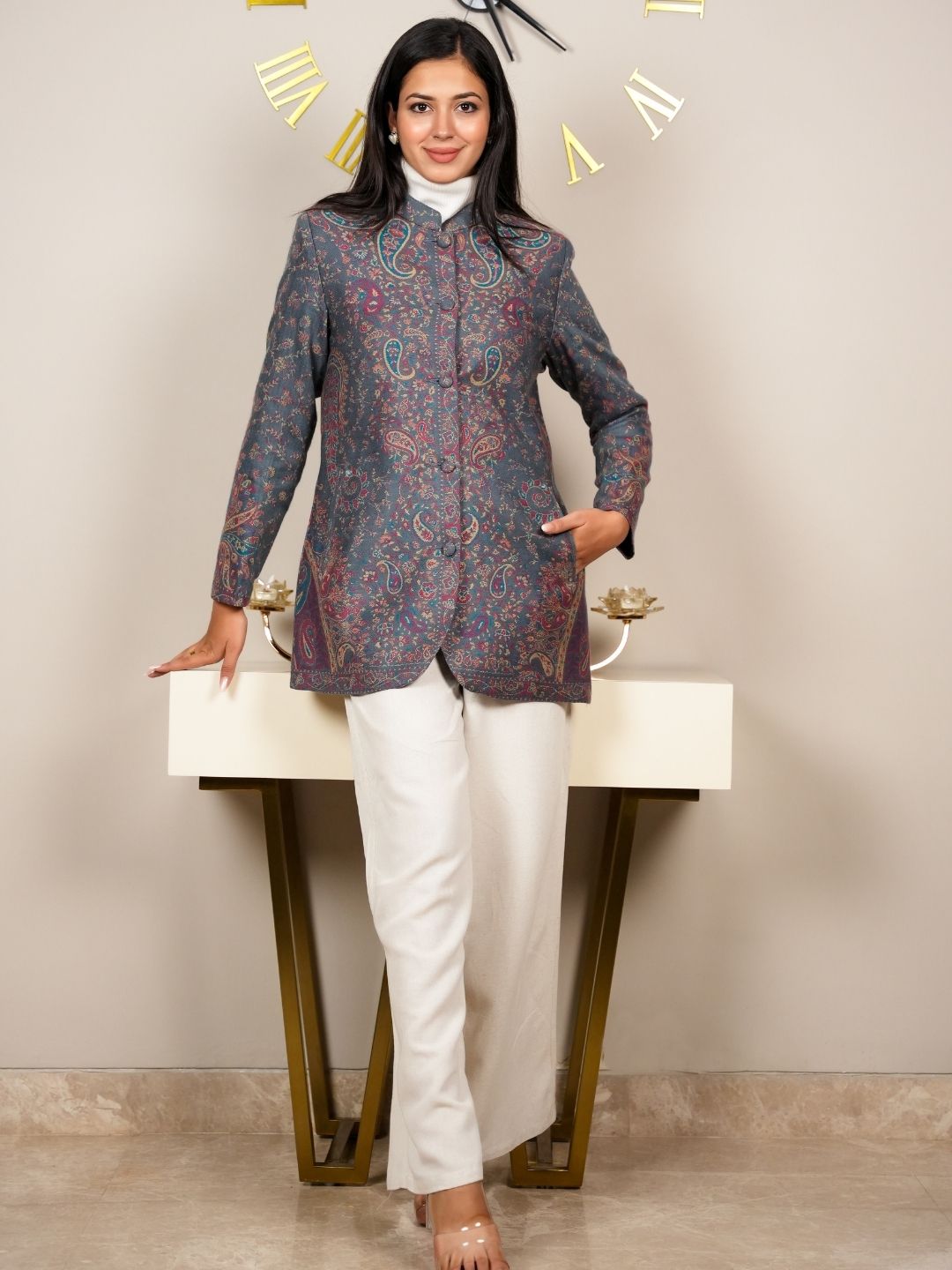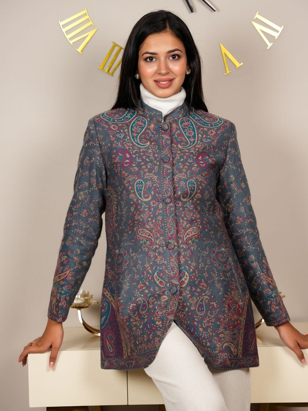 Adorned with intricate Kani patterns that showcase the craftsmanship and heritage of traditional weaving, adding a unique touch to the coat. Designed to drape beautifully, this coat flatters your figure while allowing for comfortable movement.